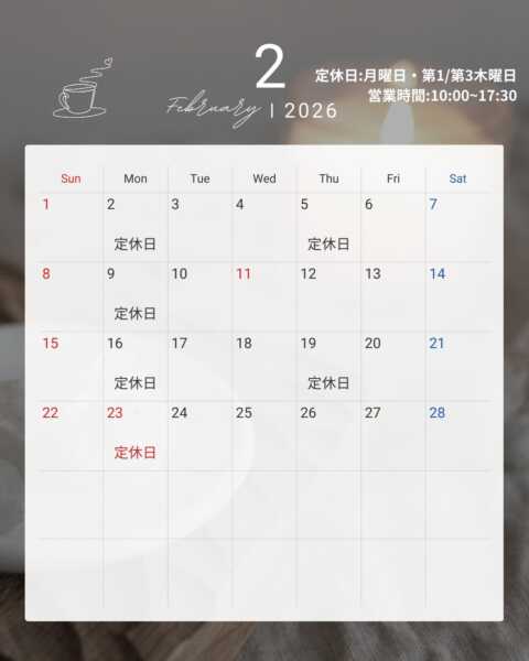 2月定休日のお知らせ2026年1月30日お知らせ ご覧いただきありがとうございます。 2月定休日のお知らせです。 毎週月曜日・第1/第3木曜日定休日となっております。 営業時間 : 10:00~17:30 2月はバレンタインがありますので、皆さまのご来店心よりお待ちしております。